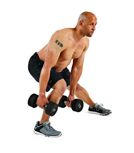 Hold a pair of dumbbells at arms length next to your sides, your palms facing each other [A]. Take a big step to your right and lower your body by pushing your hips back and bending your right knee [B]. Squat as deep as you comfortably can without allowing your lower back to round. (If you have exceptional mobility, you maybe able to lower your body until your right thigh is parallel to the floor.)Push back to the start. Thats one rep. Repeat on the other side.