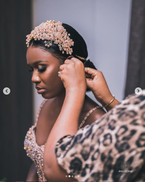 For the exchange of vows, Bertha walked down the aisle in a stunning blush pink gown that perfectly flattered her figure. We could hardly keep our eyes off the dress though, taking in the sheer, nude panels and crystal embellishment that decorated the gown from head to toe.