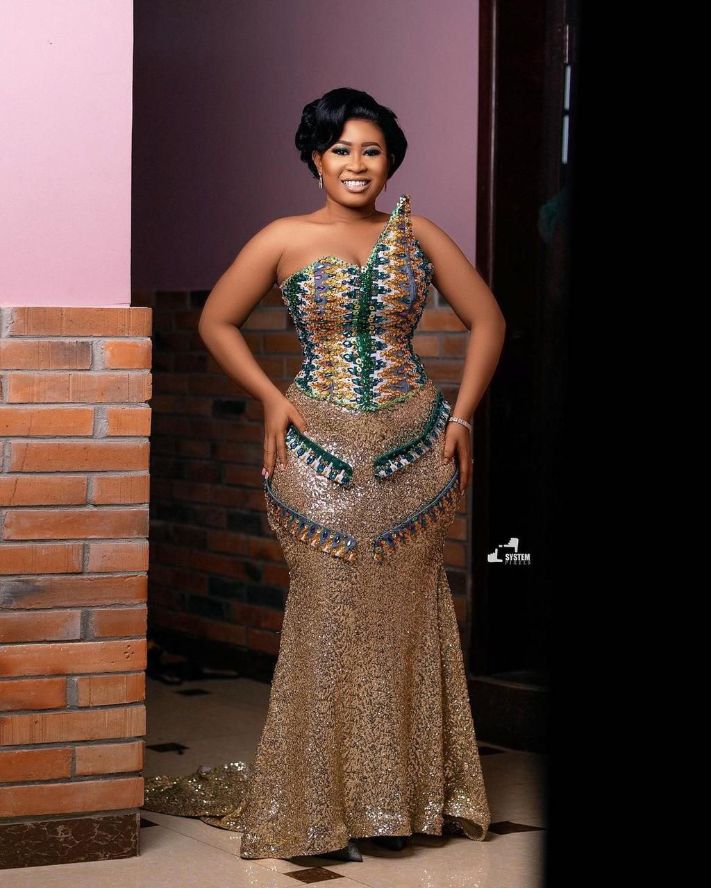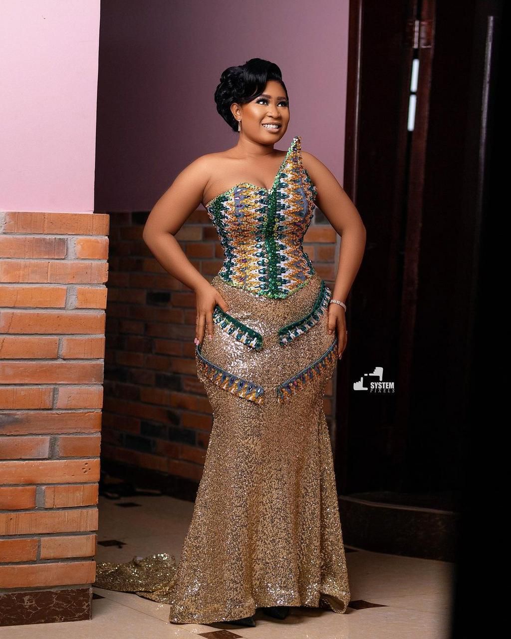 The absolute gorgeous bride wore a floor-sweeping green and gold strapless Kente combo that made her look stunning.