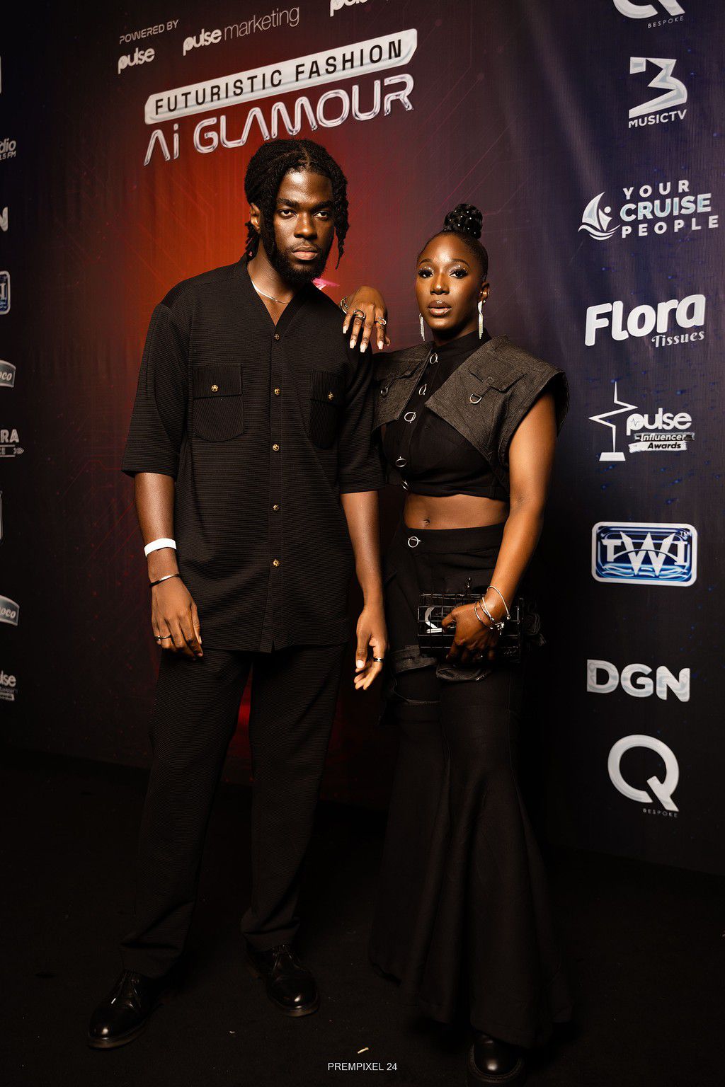 This coordinated duo wore sleek, modern black outfits: Afi’s high-waisted skirt and structured top paired seamlessly with Zuu’s textured shirt and trousers. Bold accessories and a refined monochrome palette elevated the futuristic vibe.