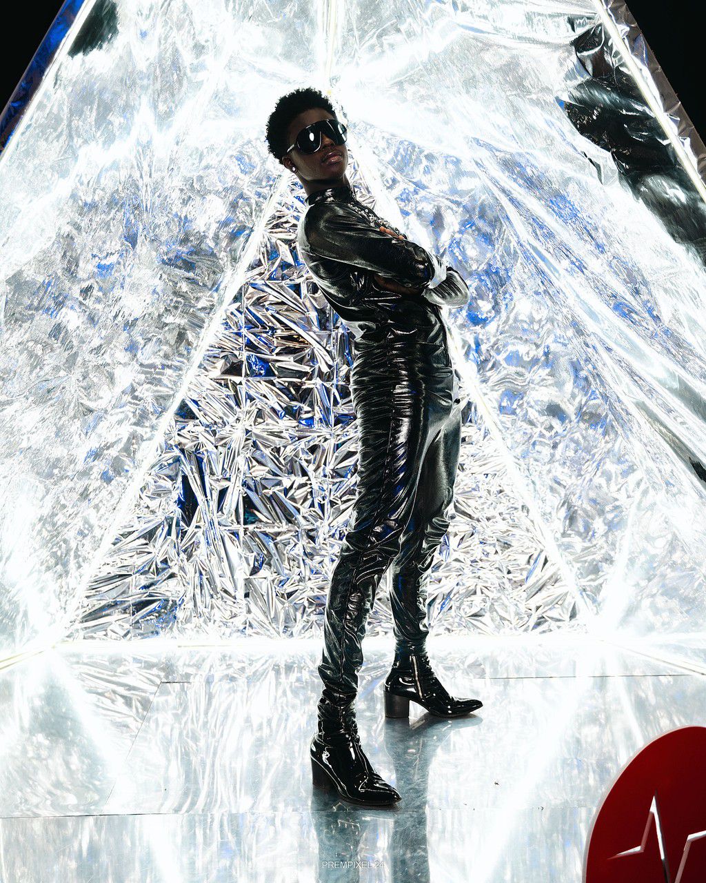 Wesley Kesse chose a streamlined leather jacket with structured shoulders, paired with tailored trousers and glossy boots. His dark sunglasses and bold accessories brought together a sleek, futuristic aesthetic.