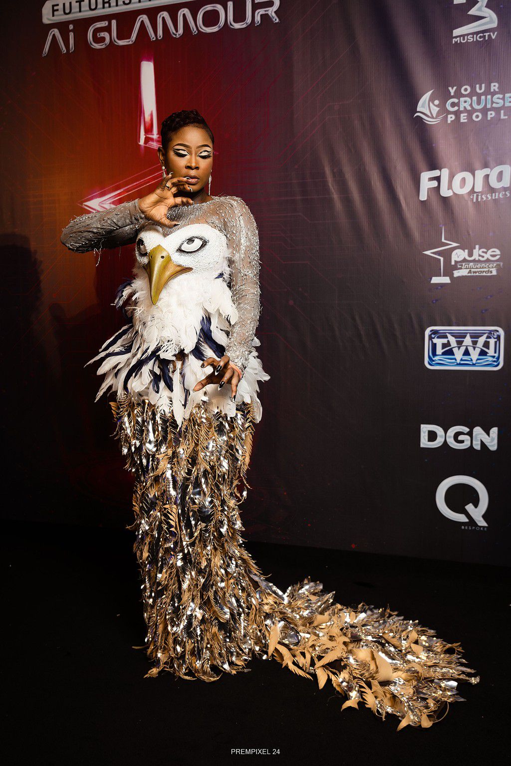 Samzymira embraced AI glamour in a striking white fringe dress, with a matching futuristic mask completing the look. Posed against the “AI Glamour” signage, Samzymira captured the evening’s theme with style.