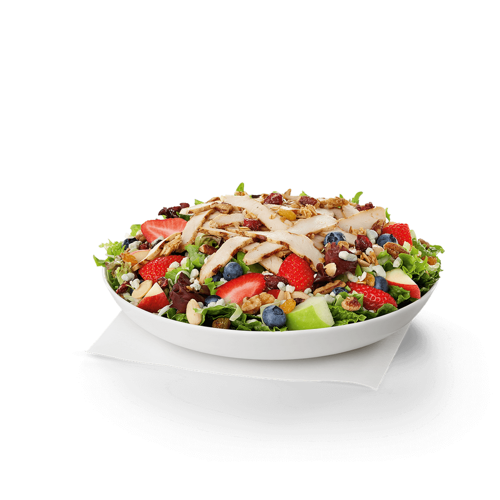 Chick-Fil-A: Market Salad Depending on what you order, Chick-fil-A is totally RD-approved. Being a Southerner, my all-time favorite fast food restaurant is Chick-fil-A," says Ivey. "I love that they offer healthier choices, including salads. The Market Salad with added grilled chicken nuggets is one of Iveys favorites since it satisfies every flavor craving. Topped with grilled chicken, chopped apples, fresh berries, blue cheese, and a light balsamic vinaigrette, its basically a farmers market in a bowl. Per serving : 320 calories, 14 g fat (3 g saturated), 26 g carbs, 13 g sugar, 580 mg sodium, 6 g fiber, 27 g protein