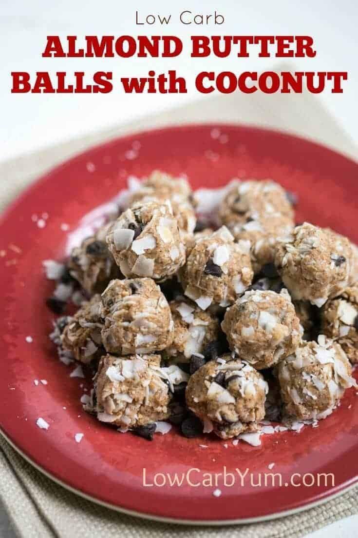 Almond Butter, Coconut, Chocolate Chip Protein Balls Stick with unsweetened coconut and these are a crazy-low-sugar treat. GET THE RECIPE Per serving: 87 calories, 7 g fat (3 g sat), 4 g carbs, 1 g sugar, 6 mg sodium, 2 g fiber, 3 g protein Low Carb Yum