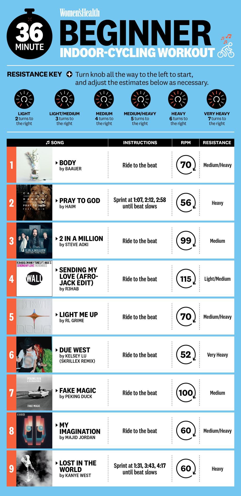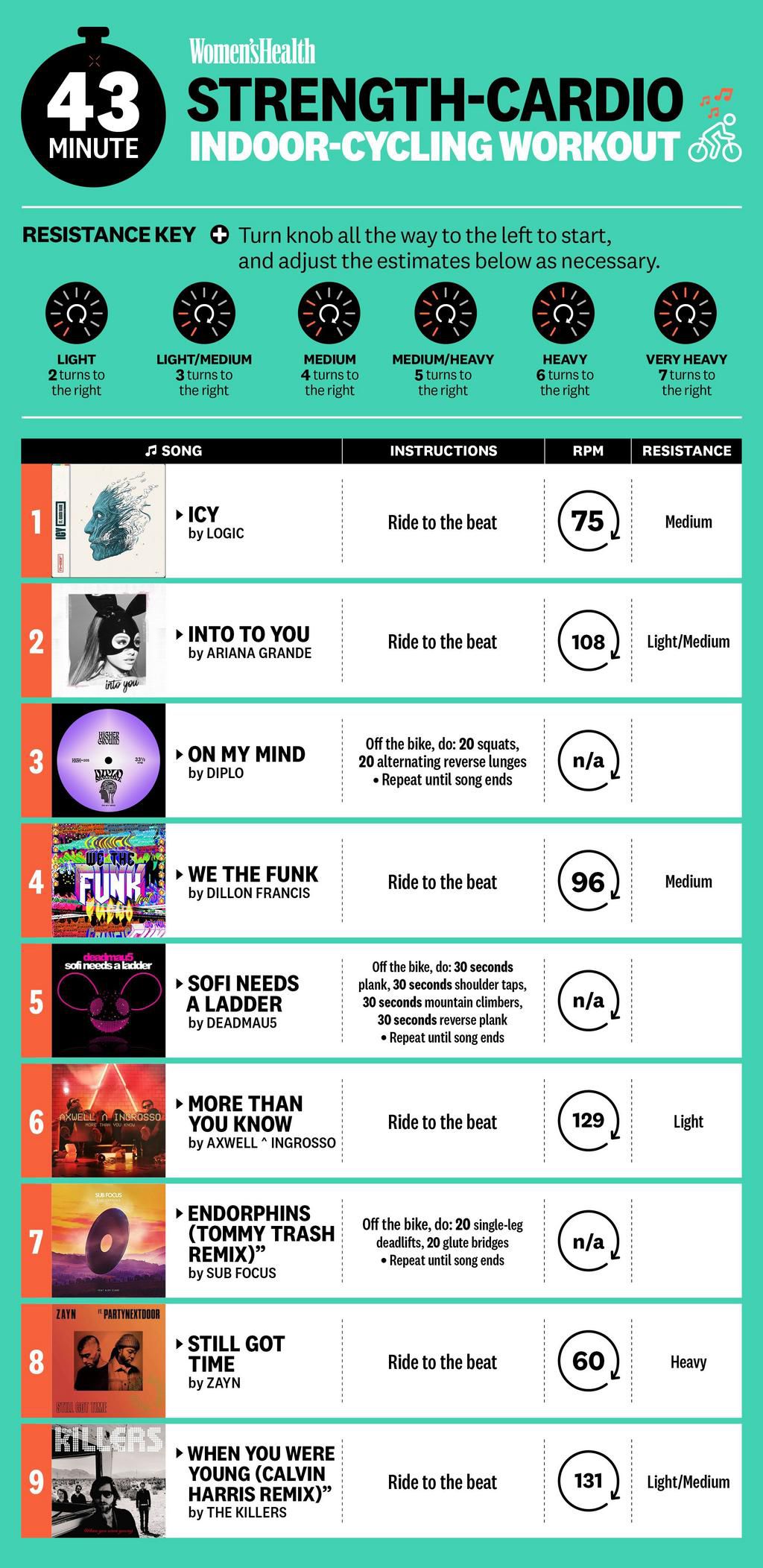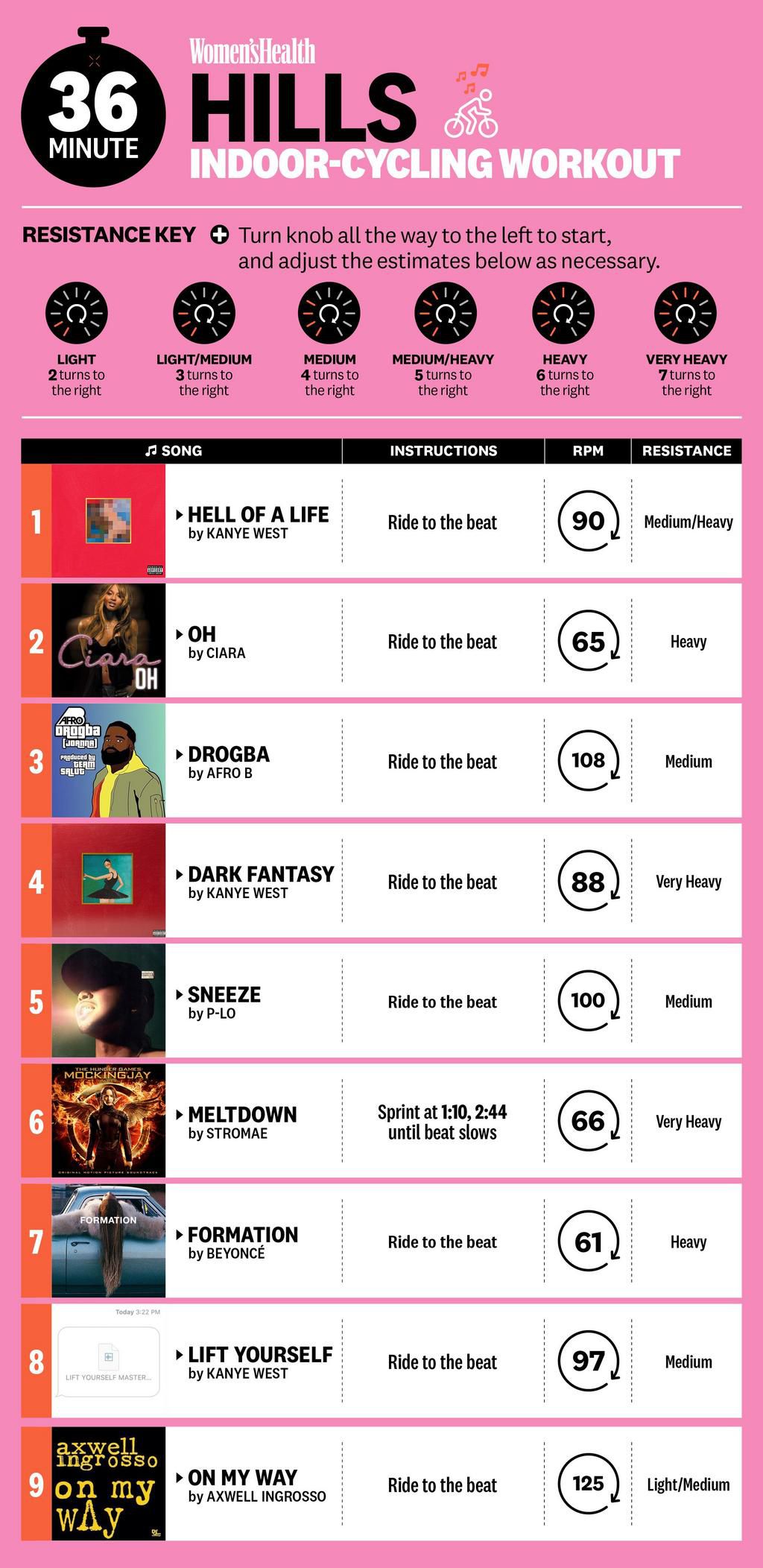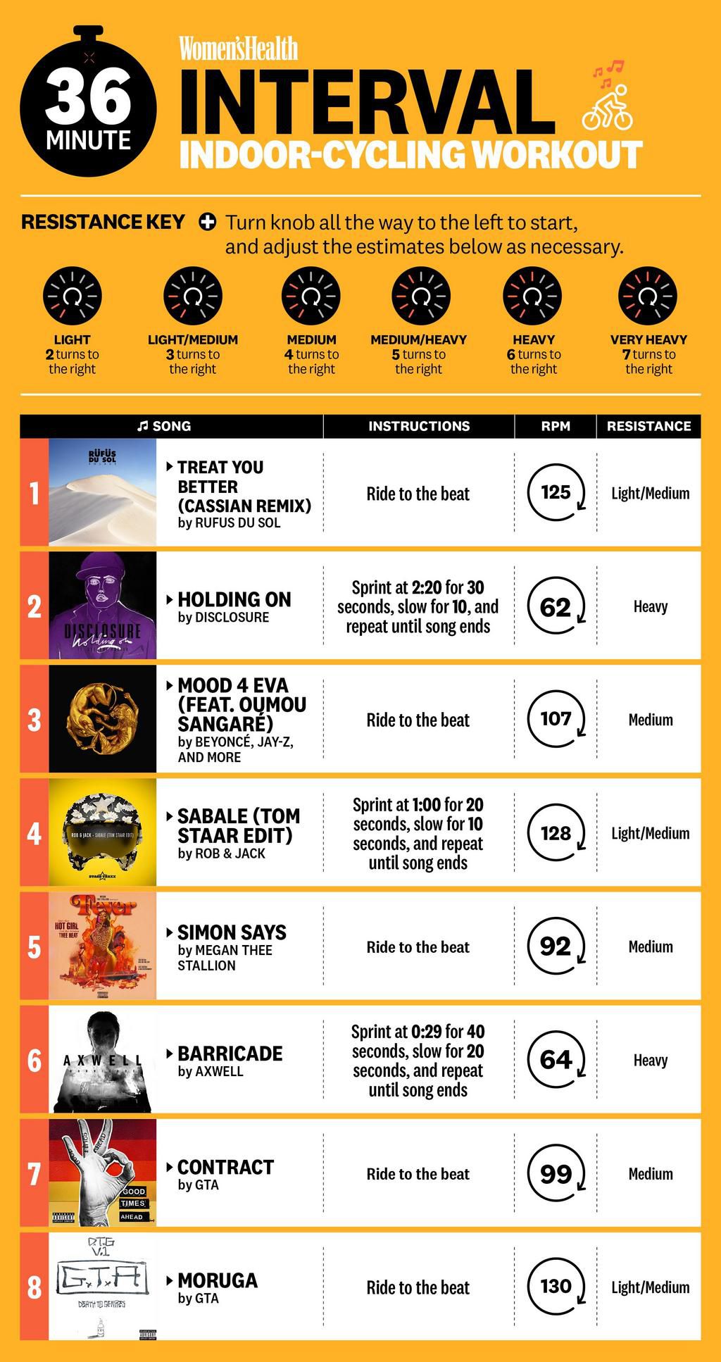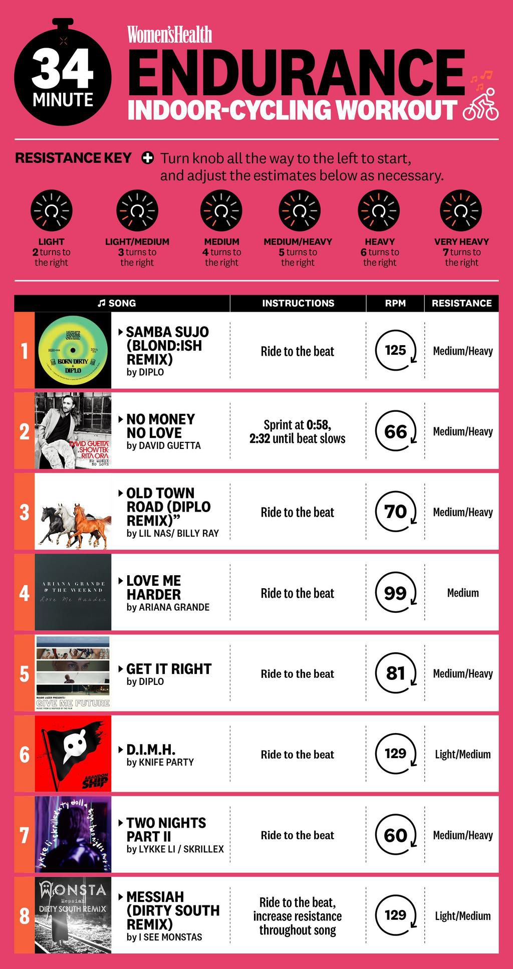 These songs might feel long to work through, but thats basically the point: You want to get your heart rate up and maintain the hard work straight to the end of each jam, so try to maintain the same speed until the music switches. For the last few minutes of the workout, keep increasing the resistance. Its all about persistence and building stamina.