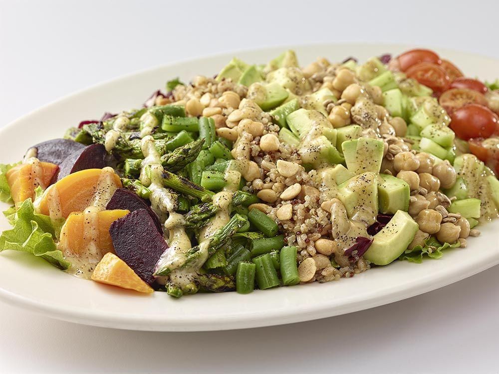 Vegan Cobb Salad Cobb salads are notorious for piling on tons of tasty ingredients, and this vegan version is no exception. This salad loads up on chickpeas, asparagus, beets, tomatoes, avocado , quinoa, nuts, and seeds. That means it hits all the marks for a balanced meal, like protein, healthy fats, and fiber. You wont miss the traditional bacon or eggs one bit, trust. Per serving: 1,080 calories, 89g fat (9g sat), 1,280mg sodium, 58g carbs, 19g fiber, 19g sugar, 16g protein Cheesecake Factory