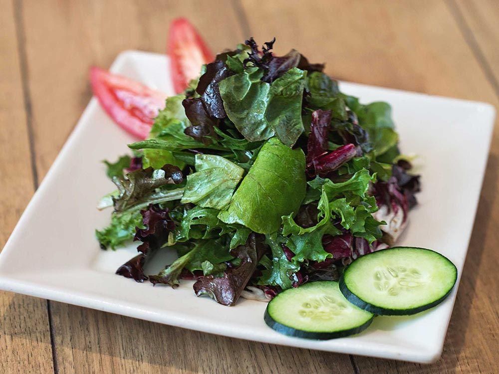 Little House Salad This no-fuss salad comes as a simple bed of mixed greens with cucumbers on the side, tossed in the restaurant's traditional vinaigrette. Its the perfect starter to whet your appetite for the rest of the meal. Per serving: 260 calories, 24g fat (2g sat), 240mg sodium, 10g carbs, 2g fiber, 6g sugar, 2g protein Cheesecake Factory