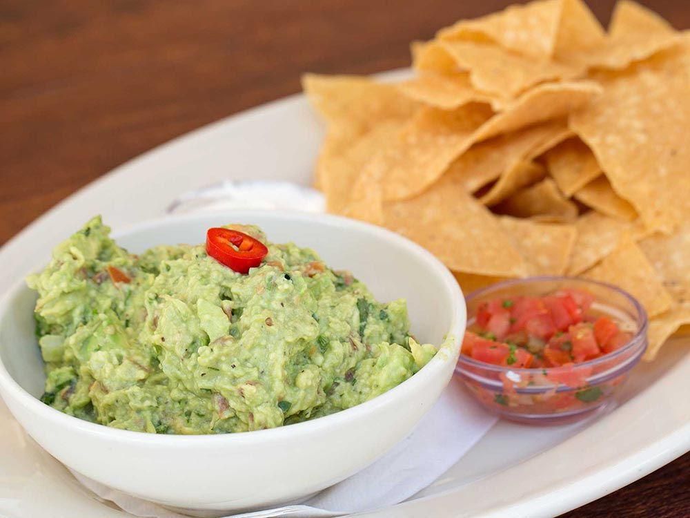 Guacamole and Chips Guac and chips are the ultimate game-day or party food, and this dish at The Cheesecake Factory does not disappoint in creamy texture or flavor. Both the chips and dip are totally vegan, and that luscious avocado will provide good fats to boost satiety. It serves two to four, so enjoy it with a crowd. Per serving: 1420 calories, 98g fat (19g sat), 1110mg sodium, 128g carbs, 32g fiber, 7g sugar, 18g protein Cheesecake Factory