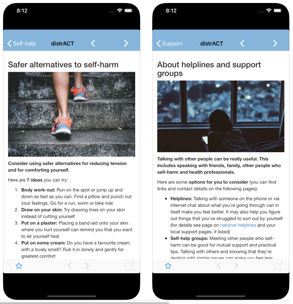 23) distrACT If youre having suicidal thoughts or thoughts of self-harm, distrACT works to give you quick, accurate information about these thoughts and how to get through them. The app was created by doctors who have expertise in self-harm and suicide prevention. Get the app on iPhone or Android for free. Courtesy