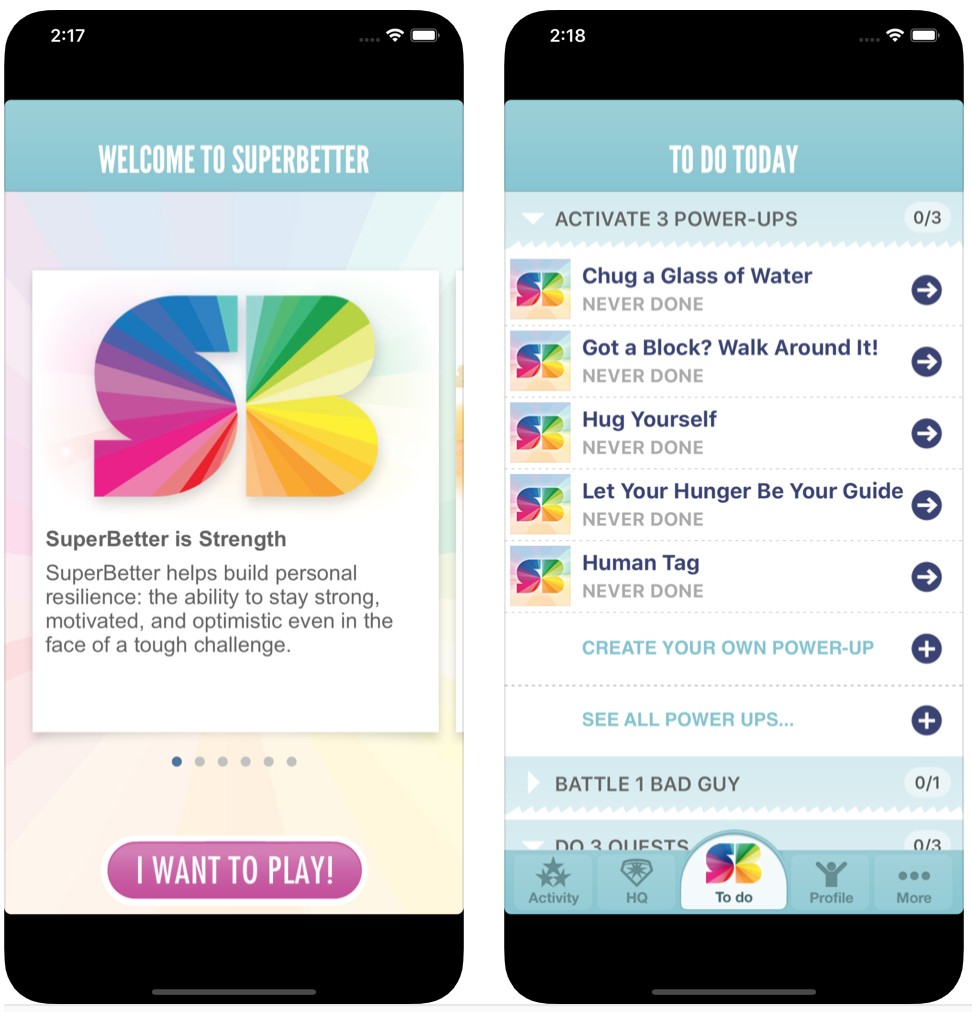 7) SuperBetter It might seem really strange to attempt to battle anxiety or stress through a superhero game, but thats exactly what this app promises it will do. In the SuperBetter app, youre a superhero battling bad guys by activating power ups. In order to do so, you have to complete real-life actions like chug a glass of water and give yourself a hug. Sounds kind of fun, and funny, no? The app is free on Apple's App Store. Courtesy
