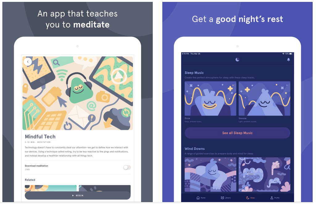15) Headspace Many therapists recommend meditation for stress relief, and Headspace can help you learn how to do it with lighthearted (and very cute) cartoons guiding each meditation. The app is free for download for iPhone or Android but offers in-app purchases. Courtesy