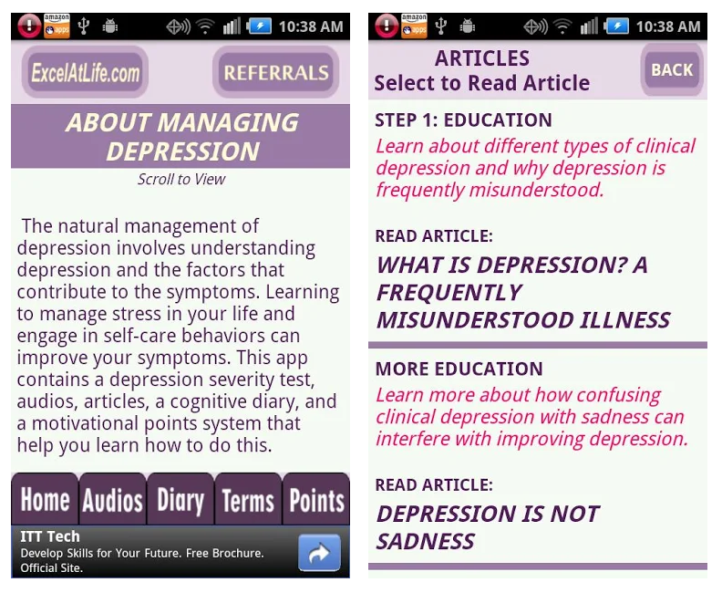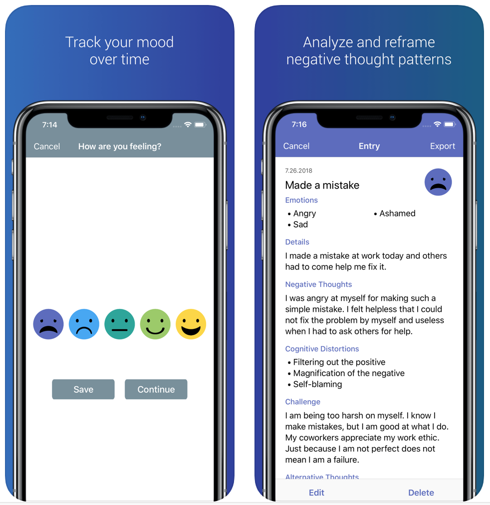 21) Depression CBT Self-Help Guide This app helps you to self-manage your depression and mood changes. It includes a thought diary as well as lessons on emotional training and relaxation. Get the app for free on iPhone or Android. Courtesy