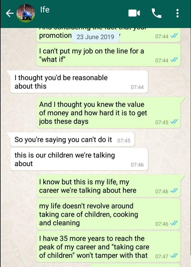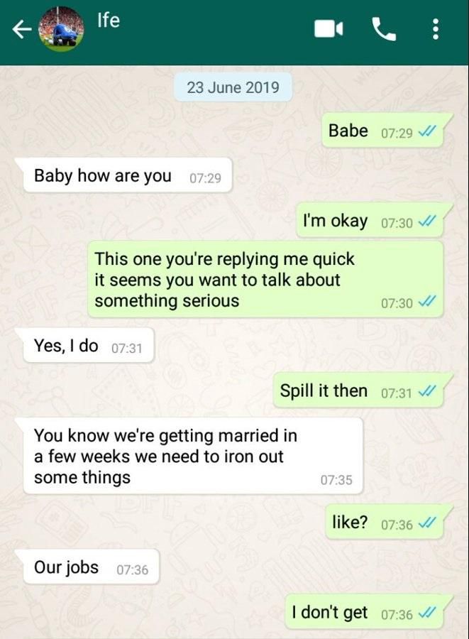 In a WhatsApp conversation making the rounds online, the said boyfriend, Ife, messaged his already pregnant would-be bride, demanding they discuss something very serious.