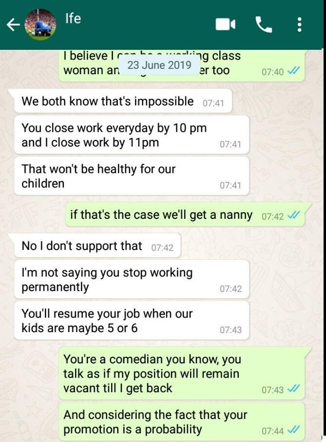 He then told his fiancée to understand the fact that she works 10 am to 10 pm and he also closes work by 11 pm, a situation he claimed would be inimical to the upbringing of their future kids.