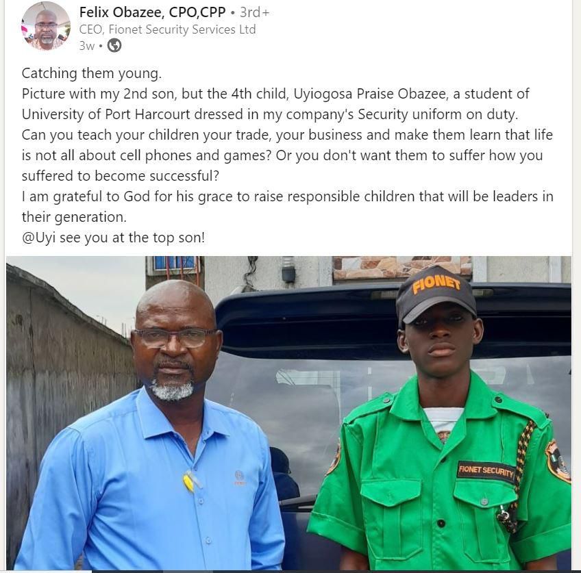 The CEO of Fionet Security Services took to LinkedIn to share photos of him and his son dressed in the company’s security uniform and disclosed that he chose to make him a security guard to make him experience the reality of life instead of pampering him.