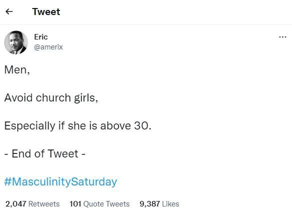 "– End of Tweet –," the Nigerian man wrote on his Twitter page on Saturday dubbed #MasculinitySaturday.