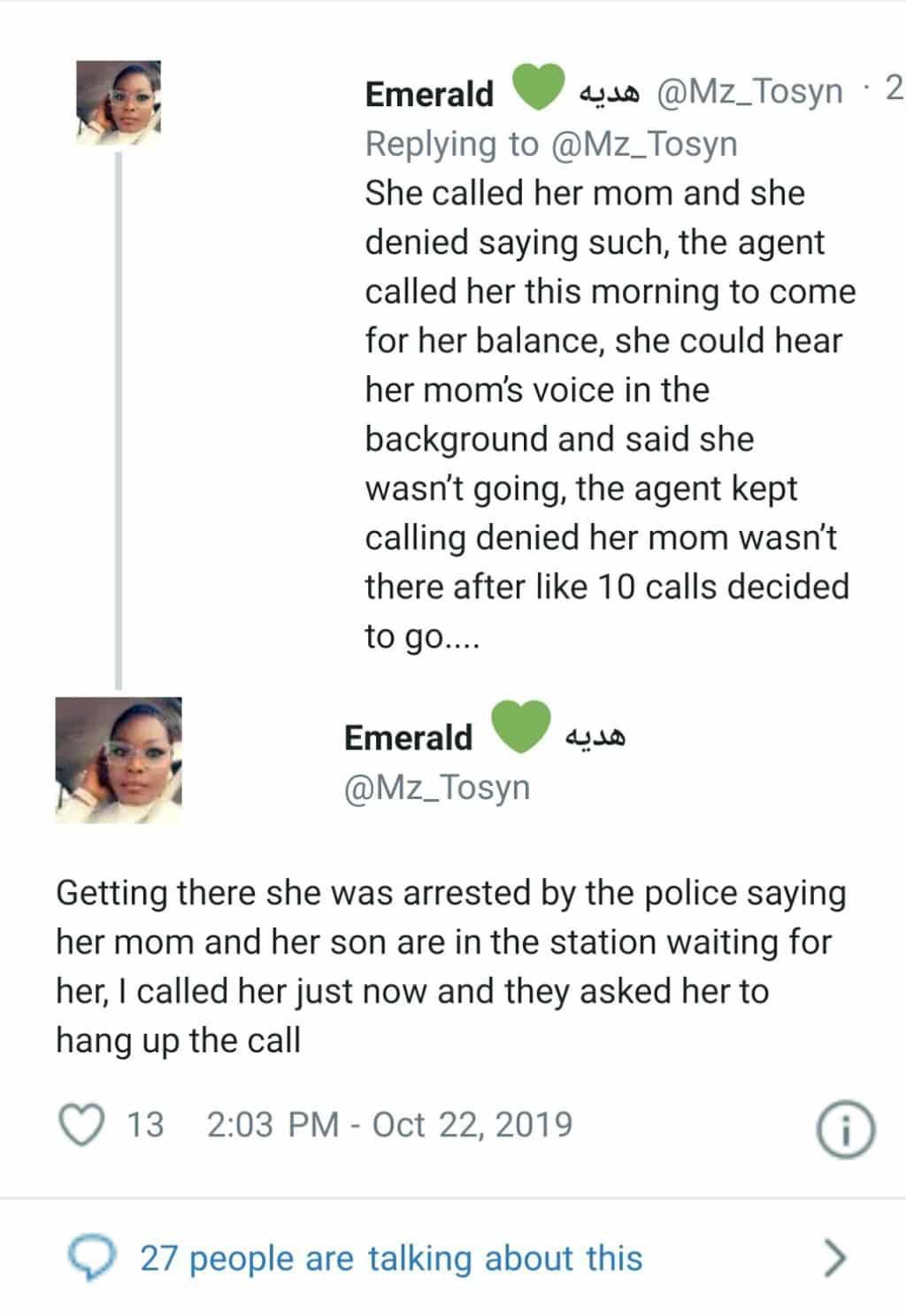 “She didn’t feel safe in the new apartment any more since her mom brought her ex. She asked the landlord for her balance and was told to come for it yesterday, she got to the agent and the agent said her mom called him not to give her without a witness…,” she wrote.