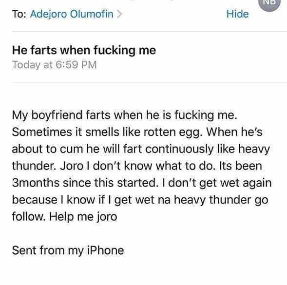 In a letter written to relationship expert and Love doctor, Joro Olumofin, the unnamed lady said: “My boyfriend farts when he is lashing me. Sometime it smells like rotten egg. When he’s about to release he will fart continuously like heavy thunder. Joro I don’t know what to do. Its been 3 months since this started. I don’t get wet again because I know if I get na heavy thunder go follow. Help me Joro.”