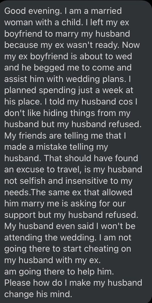 The woman reported to be a Nigerian took to social media to seek advice on how to convince her husband to give her the green light as her ex-lover needs her help so badly.
