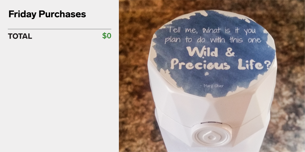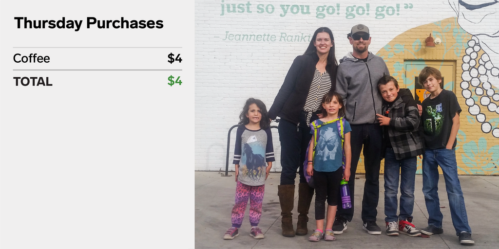 I opt out of the morning workout to do a bit of writing at the coffee shop ($2) and get prepped. We finagle the schedule to have my mom watch the kids for the two-hour window.