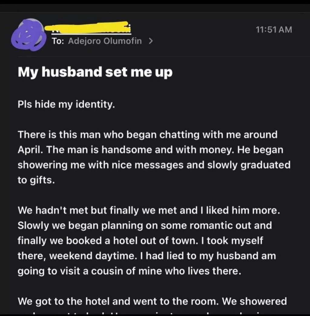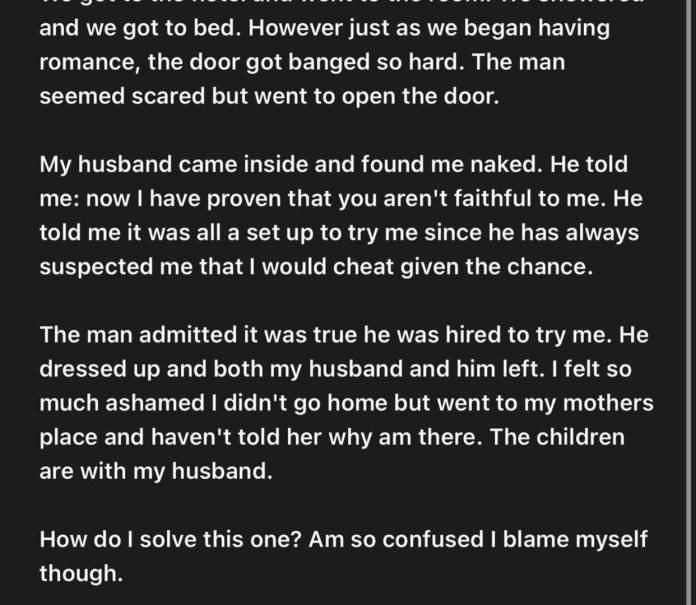 The man admitted it was true he was hired to try me. He dressed up and both my husband and him left. I felt so much ashamed I didn’t go home but went to my mother’s place and haven’t told her why am there. The children are with my husband.
