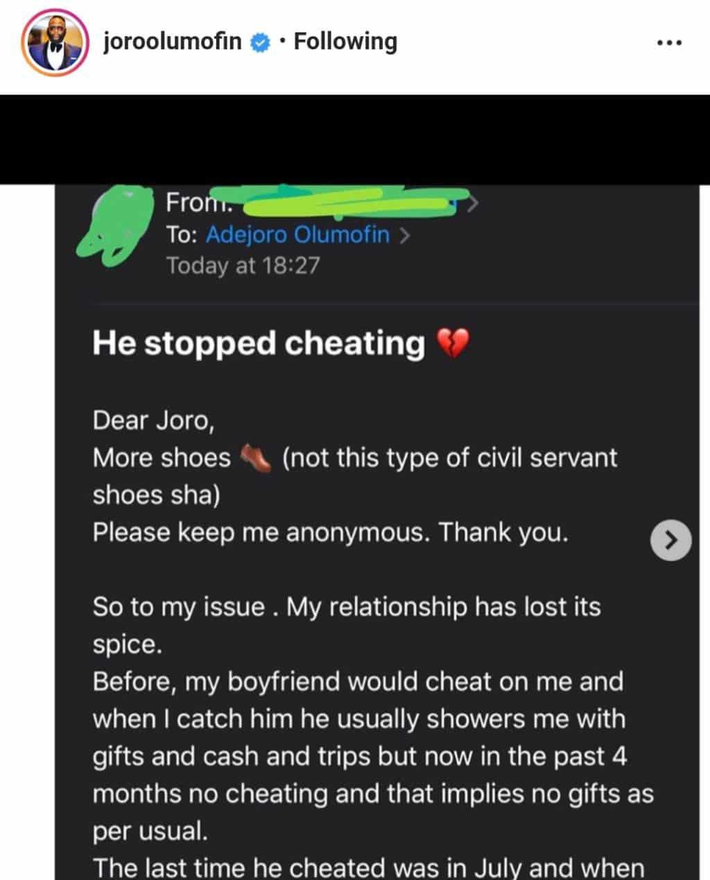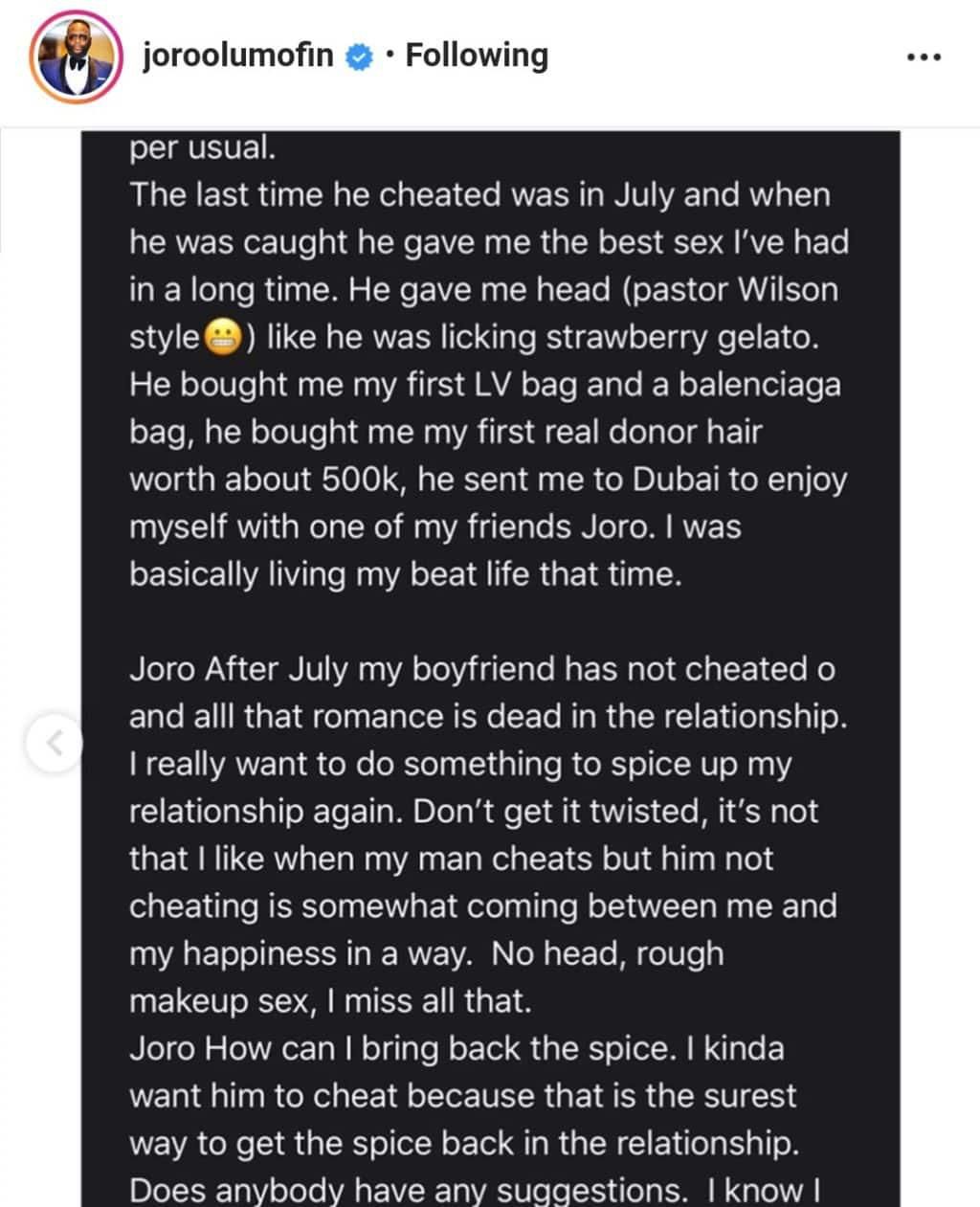 According to the anonymous lady who wrote a letter to a popular relationship expert, Joro Olumofin, whenever she catches her boyfriend cheating on her, it makes the relationship jump to its climax.
