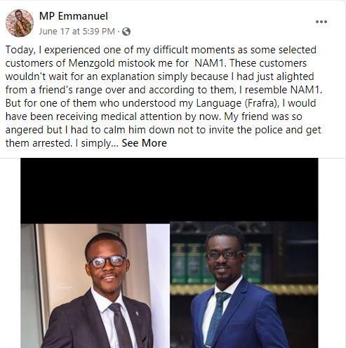 According to him, he had alighted from a friend’s range rover when he was besieged by a group of Menzgold customers who confused him for NAM1.