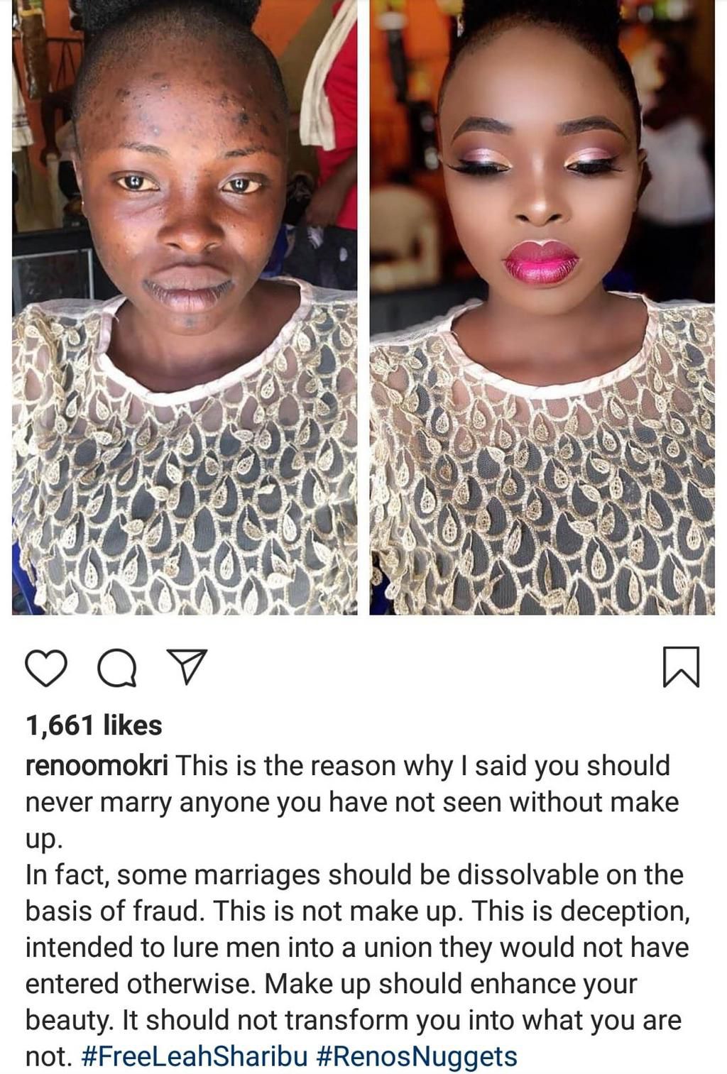 “This is why I say never marry anyone you have not seen without makeup! In fact, some marriages should be dissolvable on the basis of fraud. This isn’t makeup. This is deception, intended to lure men into a union they’d not have entered otherwise,” Bemigho Reno Omokri wrote.