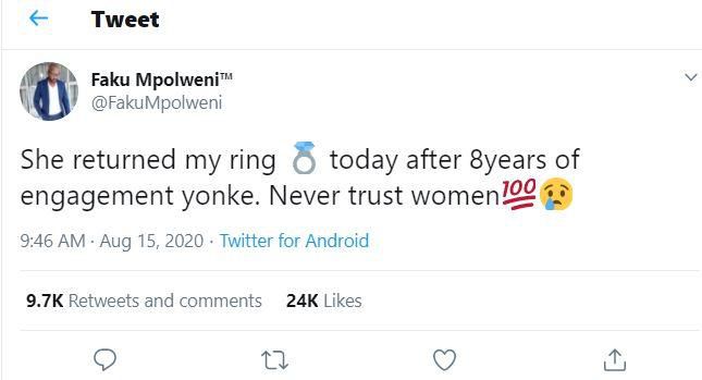 “She returned my ring today after 8 years of engagement yonke. Never trust women,” he tweeted.