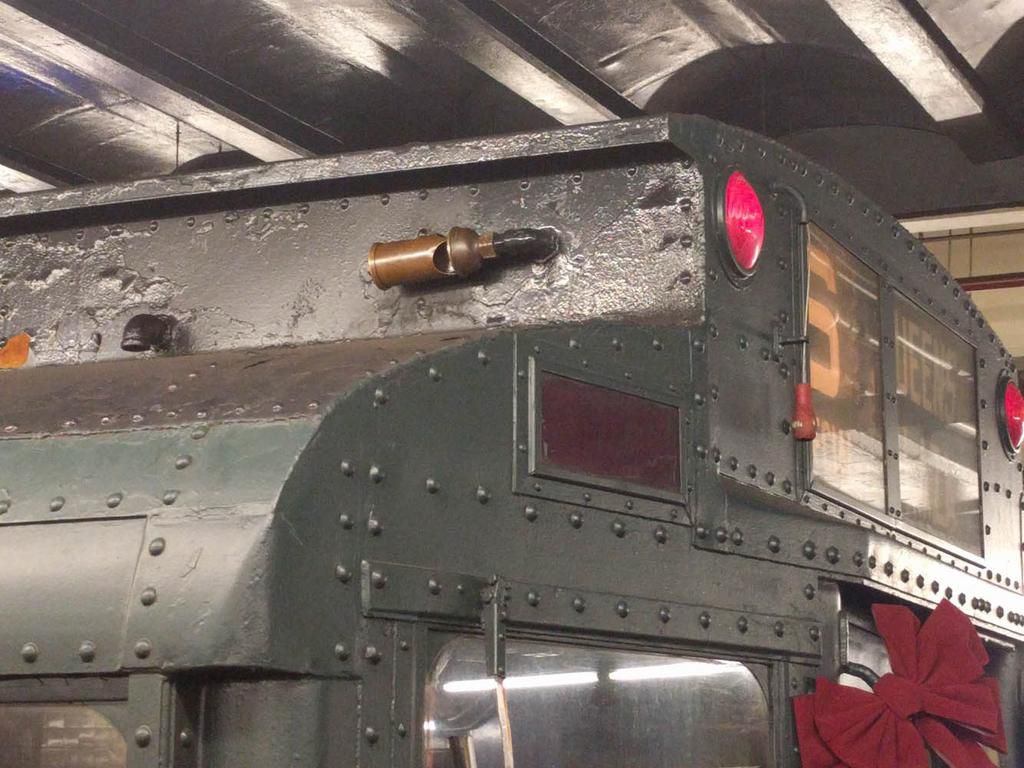 Since the vintage subway line runs during the holidays, its festooned with Christmas wreaths on the back and front: