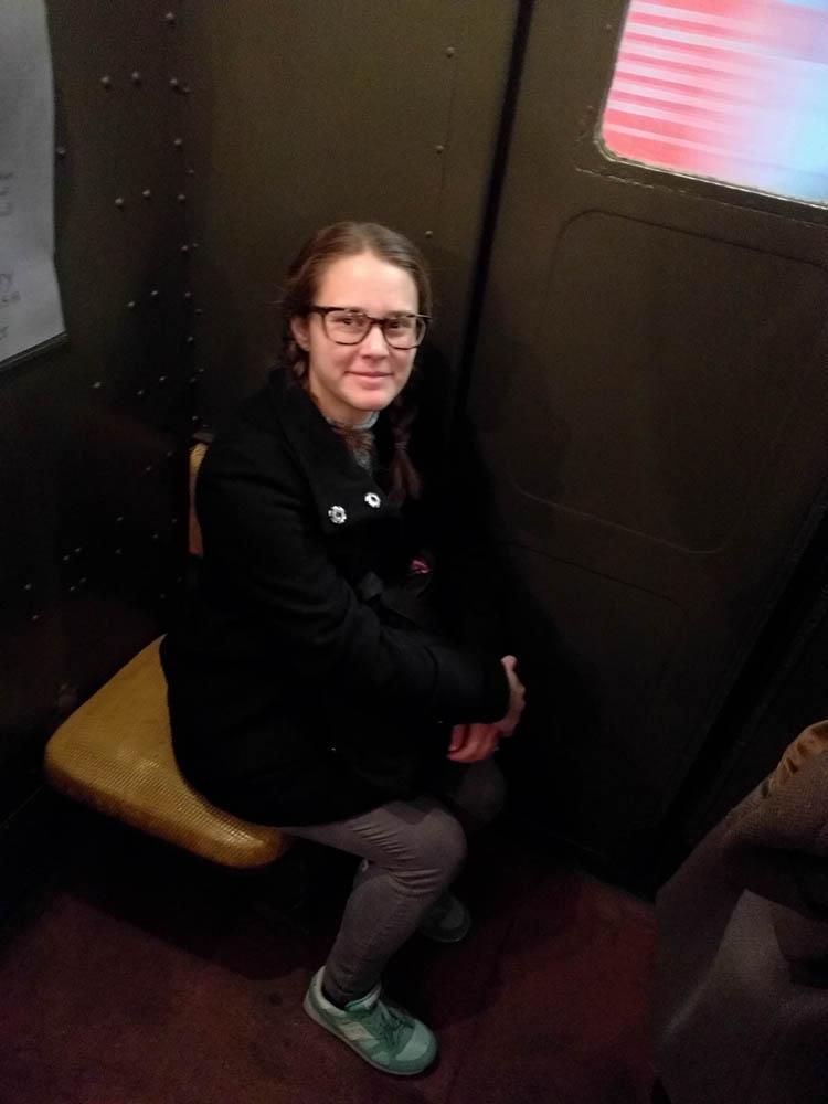 My final look into the train was perfectly representative of the bizarre mash-up of antique train cars with modern life: a woman, dressed in antique clothes, listening to music on her smartphone.