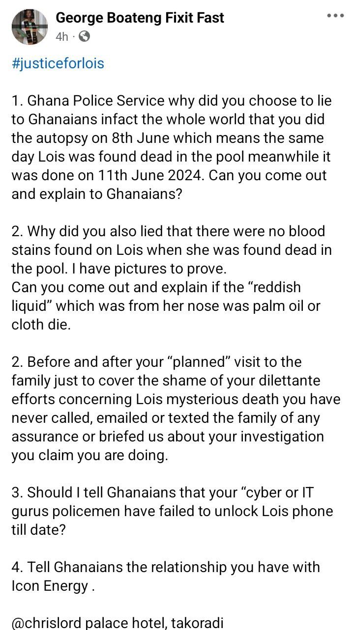 George Boateng, known as "George Boateng Fixit Fast" on Facebook, has made multiple posts questioning the Ghana Police Service's handling of his sister's case. He claims that the autopsy was actually conducted on 11 June 2024, contradicting the police statement that it was done on 8 June 2024, the same day Lois was found dead in the hotel pool.