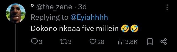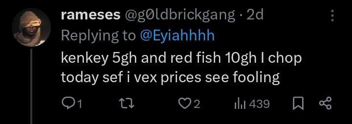 "Dokono nkoaa five millien (Kenkey for GHC500)", @the_zene replied. "Kenkey 5gh and red fish 10gh I chop today sef I vex prices see fooling", added @g0ldbrickgang. "Baby tilapia… mpatoa ooo", jested @sirlorm_G.