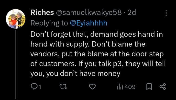 In defence, some blamed it on the cost of food items, while others attributed it to the phenomenon of demand and supply. @BobbyShm1 commented, "Kenkey no dey cost for Accra o but the fish and the meat no ahaa," and @samuelkwakye58 added, "Don’t forget that demand goes hand in hand with supply. Don’t blame the vendors, put the blame at the doorstep of customers. If you talk p3, they will tell you, you don’t have money."
