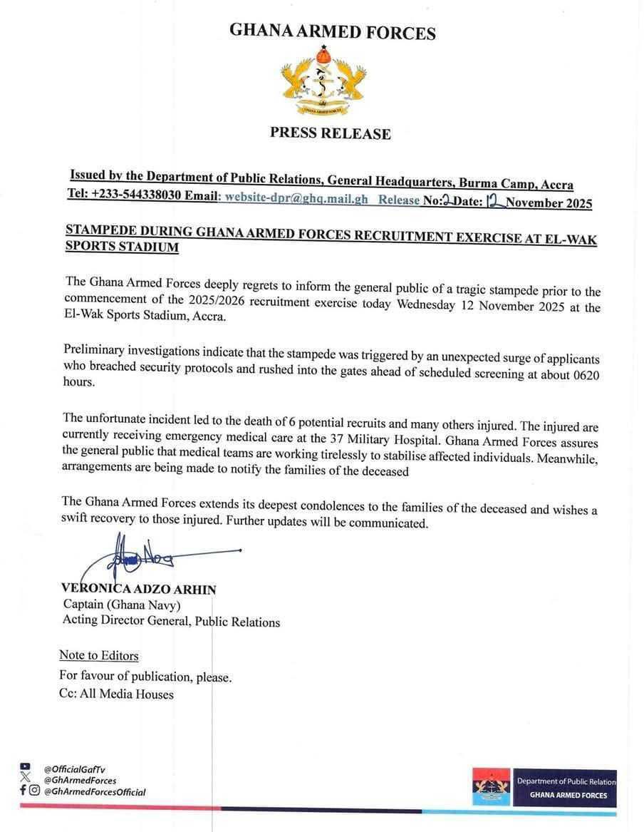 The Ghana Armed Forces (GAF) has confirmed that at least six prospective recruits have lost their lives following a stampede at the El-Wak Sports Stadium in Accra on Wednesday, 12 November 2025. The tragedy occurred during a recruitment exercise that drew thousands of hopeful applicants from across the country.