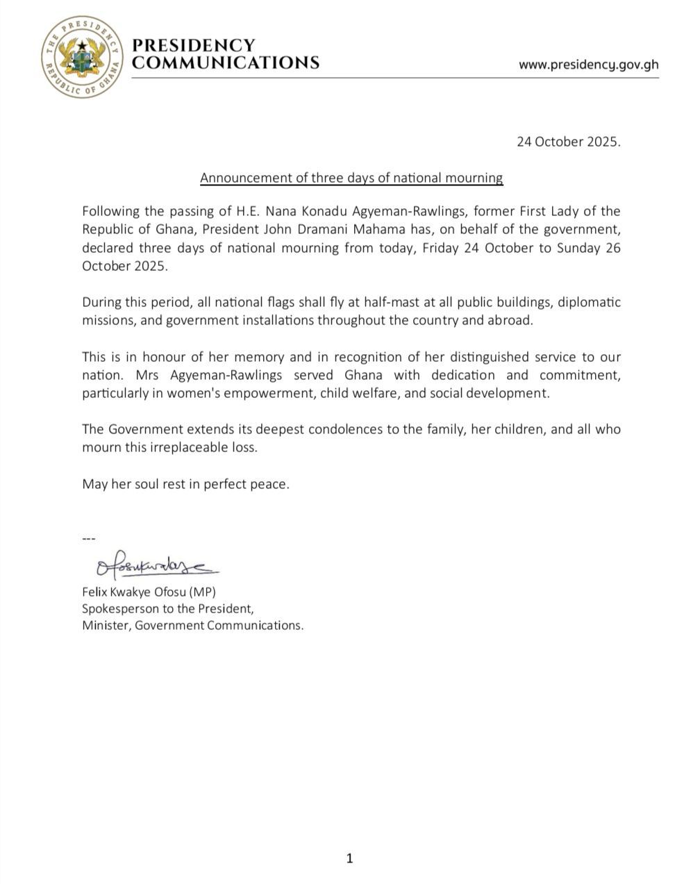 President John Dramani Mahama has declared a three-day national mourning period from Friday, 24 October to Sunday, 26 October 2025, in honour of the late former First Lady, Nana Konadu Agyeman-Rawlings.