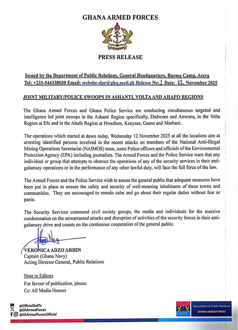 According to a joint statement signed by Captain (Ghana Navy) Veronica Adzo Arhin, Acting Director General of Public Relations for the Ghana Armed Forces, the swoops form part of a broader strategy to restore law and order following the recent series of coordinated assaults on security personnel and environmental officials working to clamp down on illegal mining, popularly known as 'galamsey.'