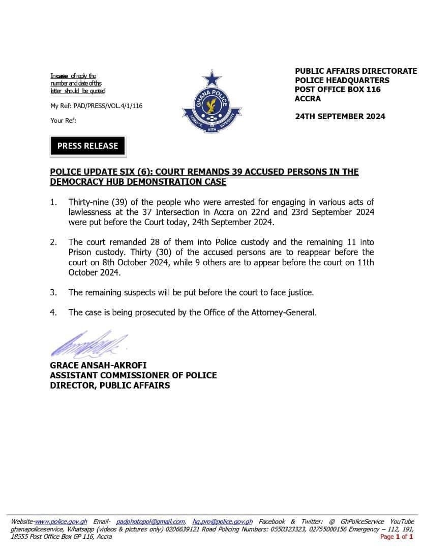 In a statement released by the Ghana Police Service, it was revealed that 28 of the accused have been remanded into police custody, while the remaining 11 were transferred to prison custody. The court has scheduled the next appearance for 30 of the accused on 8th October 2024, with 9 others expected to reappear on 11th October.