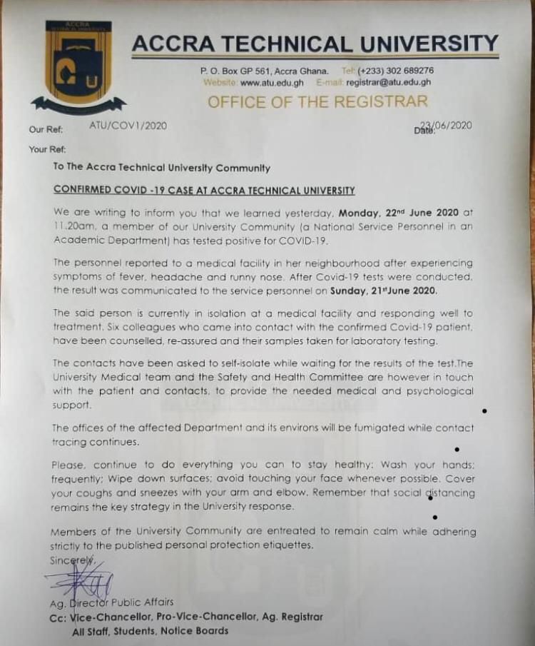 In a statement, management of the Accra Technical University said the COVID-19 infection was confirmed on Monday, June 22, 2020.