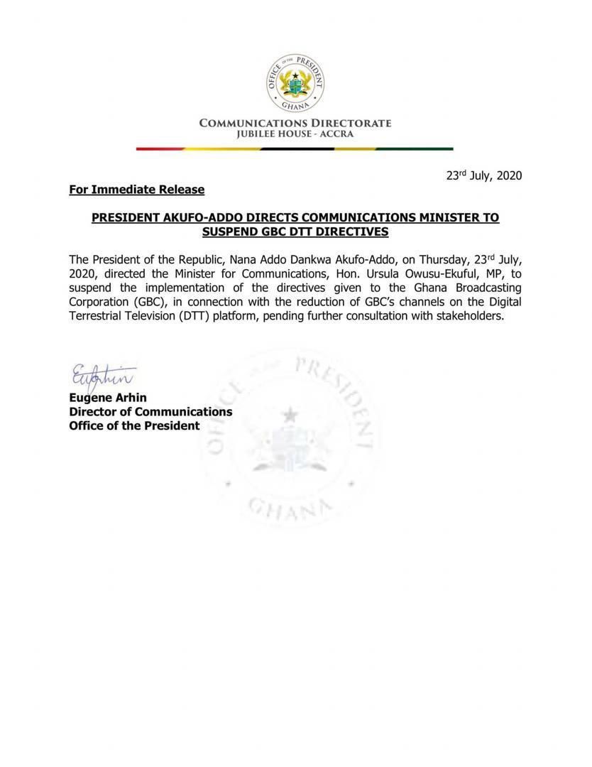 “The President of the Republic, Nana Addo Dankwah Akufo-Addo on Thursday, 23rd July, 2020, directed the Minister for Communications, Hon. Ursula Owusu-Ekuful, MP, to suspend the implementation of the directives given to the Ghana Broadcasting Corporation (GBC), in connection with the reduction of GBC’s channels on the Digital Terrestrial Television (DDT) platform, pending further consultation with stakeholders,” the statement said.
