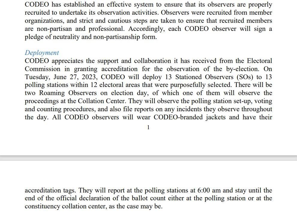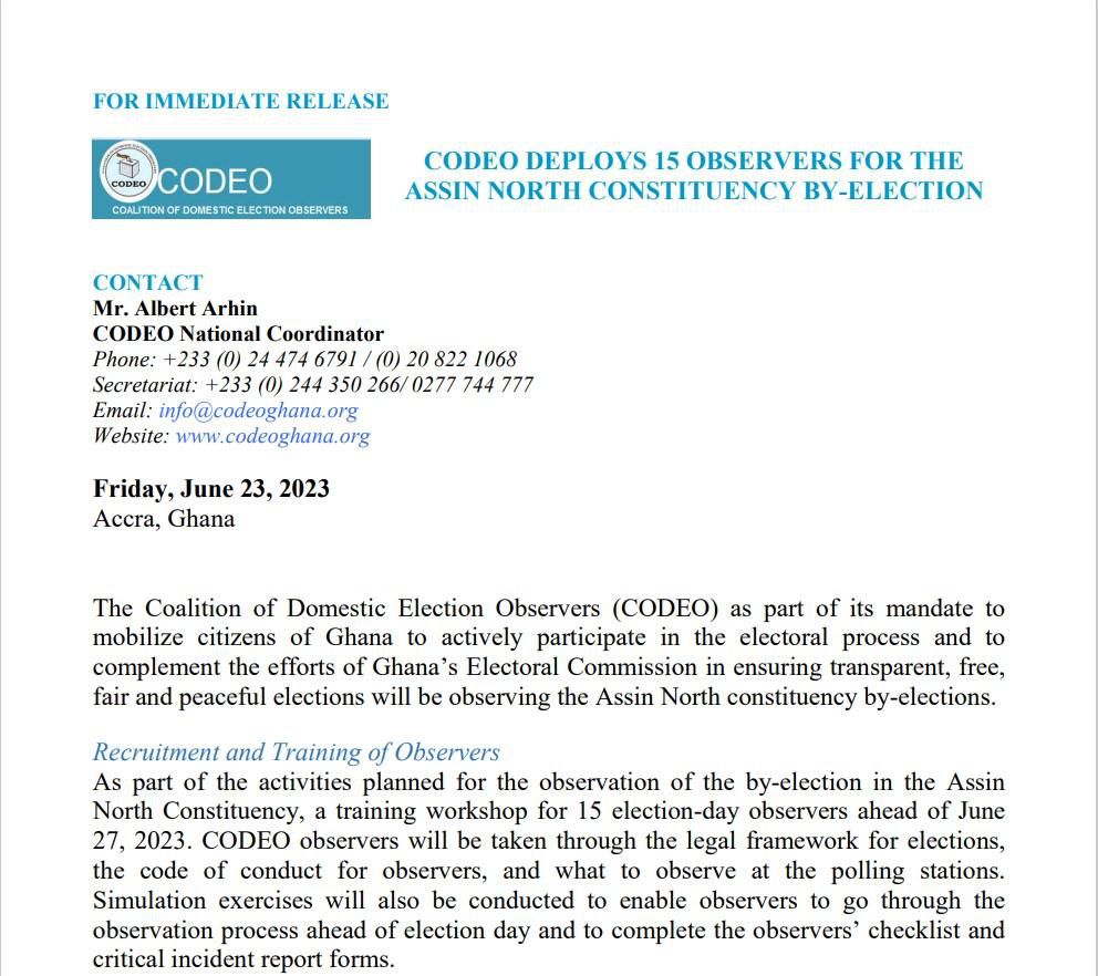 CODEO deployed 15 election observers for the Tuesday, June 27, 2023 by-election in the Assin North constituency, of which 13 observers will be deployed to 13 polling stations within 12 purposefully selected electoral areas, while the two others will be roaming observers on election day, with one of them observing proceedings at the collation center, to observe the polling station set-up, voting and counting procedures, and also file reports on any incidents they observe throughout the day.