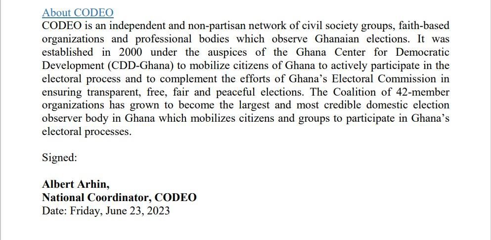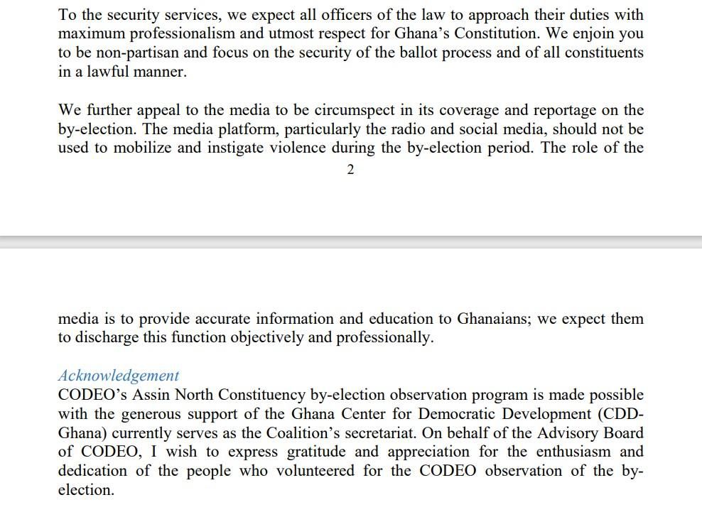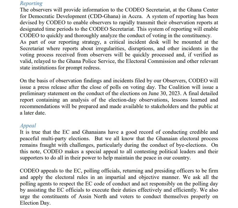 “CODEO appeals to the EC, polling officials, and returning and presiding officers to be firm and apply the electoral rules impartially and objectively. We ask all the polling agents to respect the EC code of conduct and act responsibly on the polling day by assisting the EC officials to execute their duties effectively and efficiently. We also urge the constituents of Assin North and voters to conduct themselves properly on Election Day.