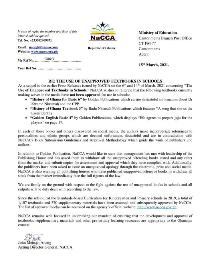 NaCCA, therefore, asked the publisher, New Golden Publications, to withdraw the books from the market with “immediate effect,” as well as other “unapproved books” that it may have on the market but has not been mentioned in the letter.