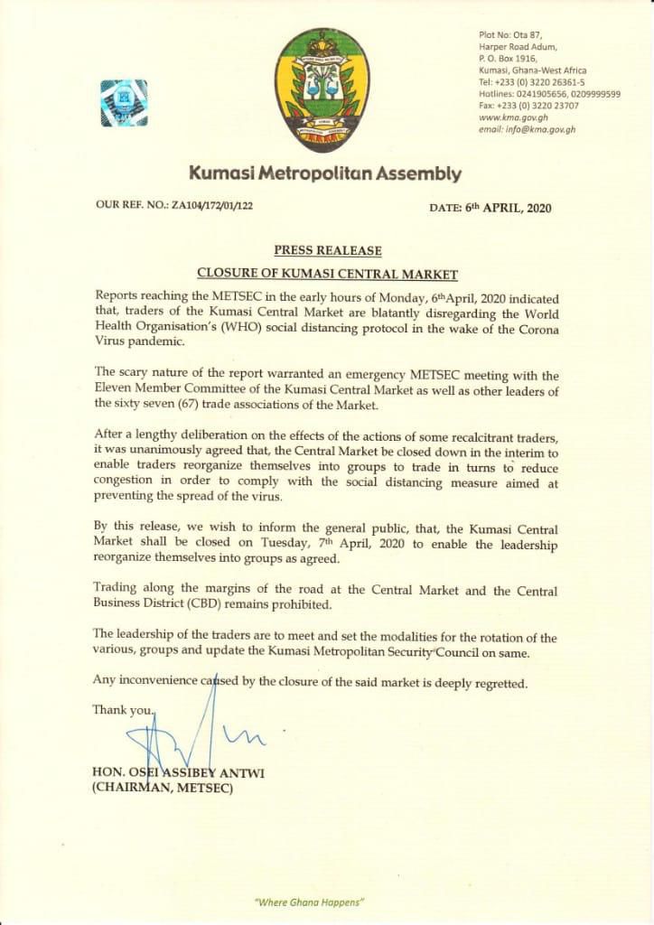 A statement signed by the Mayor, Osei Assibey Antwi, said the decision to close down the market was adopted after an emergency meeting with the Kumasi Metropolitan Security Council (METSEC).