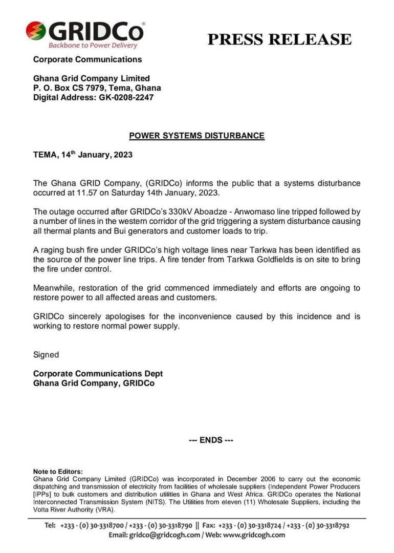 In a statement released by GRIDco, apologizes for the inconvenience caused by the incident, blaming the power cut on a bushfire.