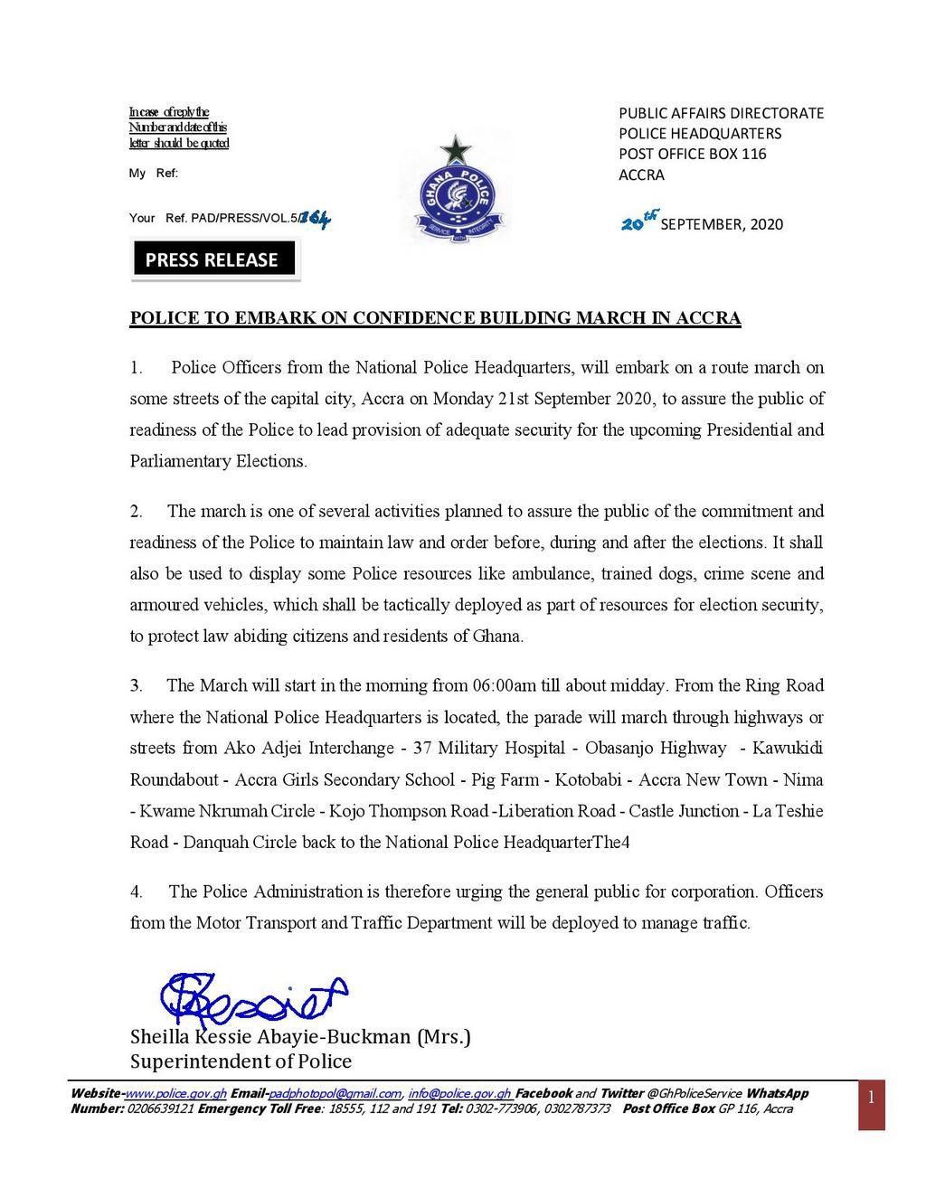 “The March is one of several activities planned to assure the public of the commitment and readiness of the Police to maintain law and order before, during and after the elections,” the release said.