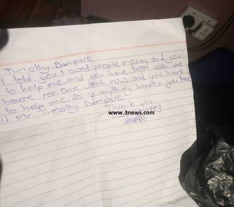 The note reads: “Dear Mr. Timothy Dampare, I told you that I owed people money and you decided to help me, and you have been with me in my house for one week now and you have refused to help me, so if anything happens you have caused it Mr. Timothy Dampare. Thank you 0249134983.”