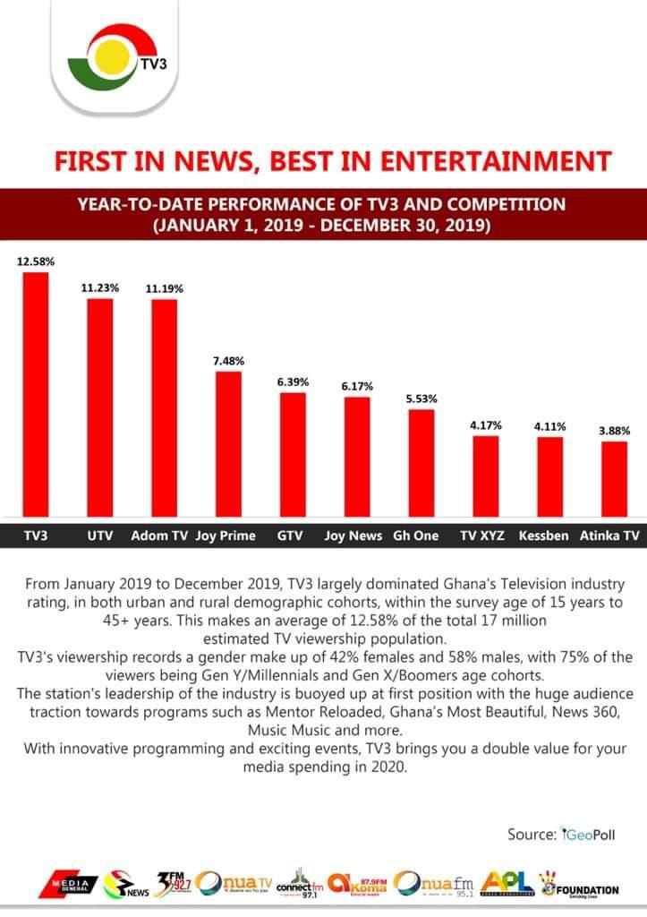 At the end of December 2019, TV3 topped the monthly performance recording an average share of 14.34% equivalent to 2,444,626 impressions. UTV and Adom TV maintained their second and third spots garnering an average share of 13.89% and 10.42% respectively.