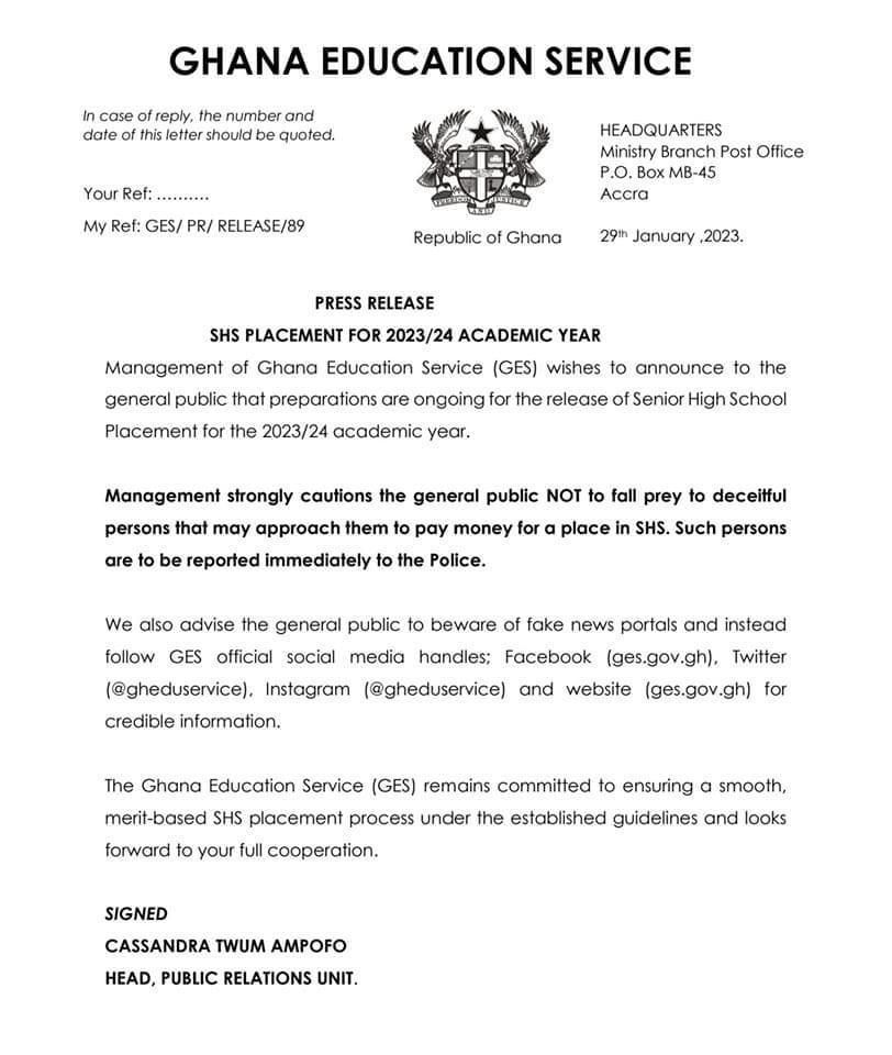 “The Ghana Education Service (GES) remains committed to ensuring a smooth, merit-based SHS placement process under the established guidelines and looks forward to your full cooperation,”