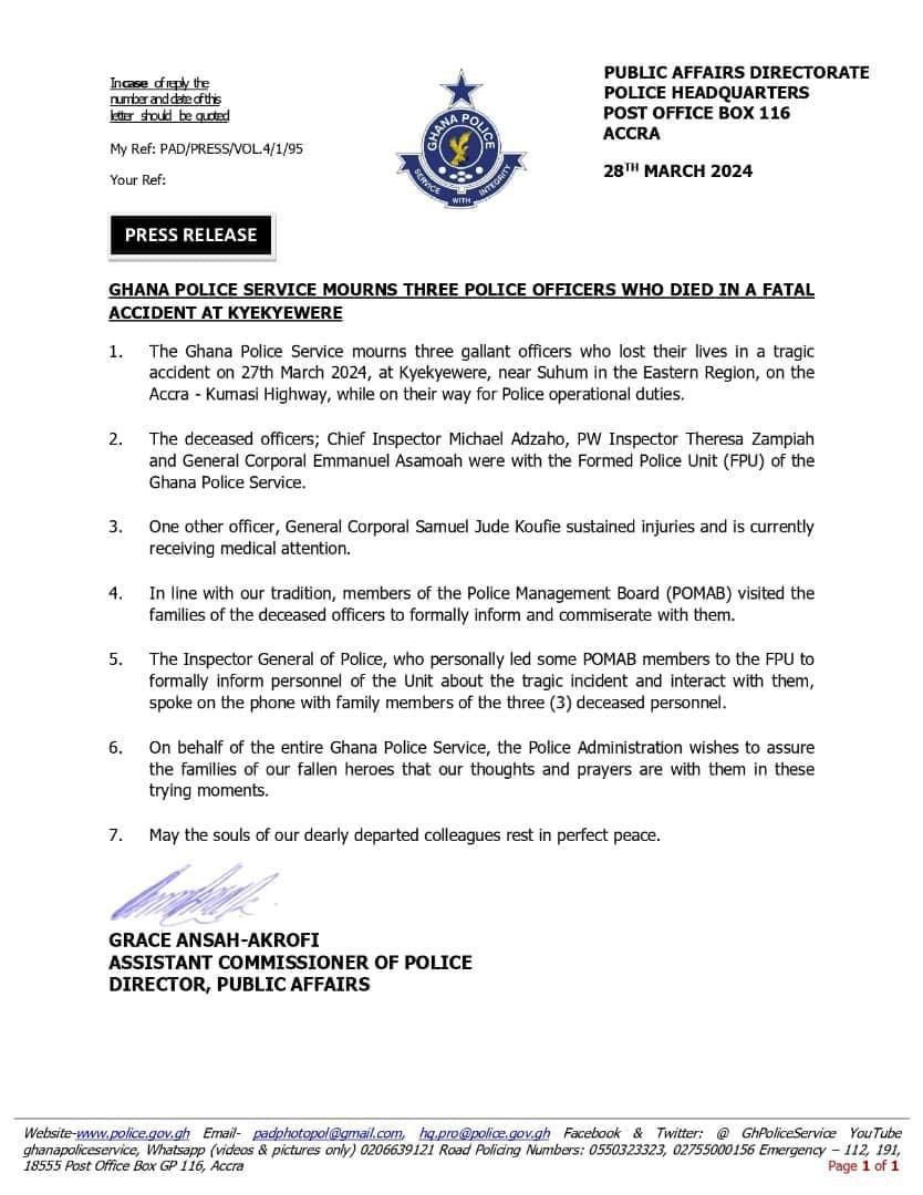 Among the deceased are Chief Inspector Michael Adzaho, PW Inspector Theresa Zampiah, and General Corporal Emmanuel Asamoah, all serving in the Formed Police Unit (FPU) of the Ghana Police Service. Another officer, General Corporal Samuel Jude Koufie, sustained injuries and is currently undergoing medical treatment.